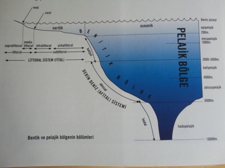 Yerküre yüzeyinin %71’i su geri kalan %29’u karalar (kıta ve adalar) ile kaplıdır. Bu demektir ki, gezegenimizin yüzeyinin 2/3 den fazlası okyanus, deniz , göl ve akarsulara aittir. Okyanusların dünya üzerindeki ortalama derinlikteki 4000 metre olmakla birlikte, 10 000 metre üzerinde olan birden fazla çukurluk alan bulunduğu bilinmektedir. Bilinen tüm derinliklerde canlı organizmalar var olmakla birlikte, derinliklere göre dağılımları çok düzensizdir. Denizlerdeki yaşam, yüzey suları ile yüzeyden bir kaç yüz metre aşağı tabakalara kadar olan üst bölümde yoğunluk kazanmıştır. Besin bölgesi de, deniz ve okyanusların bu üst bölgeleridir. Derin sularda ışığın azalması ve belirli bir derinlikten (yaklaşık 200 metre) sonra tamamen yok olması sonucunda canlılarda azalır. Bu açıdan bakıldığında denizleri, 200 metrenin aşağısında olan bölümü ile “derindeniz”, bu derinliklere kadar olan bölümü ite de “sığ deniz? olarak ayırt etmek yanlış olmaz. Ancak bu ayırım ekolojik koşullar açısından yeterli olamaz. Denizel ortamlar, ekolojik koşullar açısından Bentik Bölge ve Pelajik Bölge olmak üzere iki büyük bölümde incelemelidirler. Bentik bölge, deniz ve okyanusların sahillerden itibaren en derli yere kadar olan tüm diplerden; pelajik bölge ise bentik bölgeyi de örten tüm su kütlesinden oluşur.
