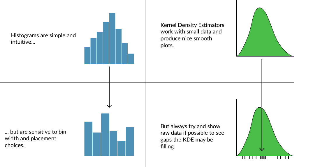 - Okuyucu için sezgiseldirler. Yoğunluk, çoğu insanın anladığı bir şeydir, çubuk ne kadar yüksekse, o aralıktaki bir değer de o kadar sık veya olasıdır. Ayrıca yorumlanabilirler. Varsayılan biçimlerinde, bir çubuğun y ekseni seviyesi, verilerinizdeki kaç noktanın x bölme aralığı içinde kaldığına karşılık gelir. Bu güzel ve anlaşılması kolay.