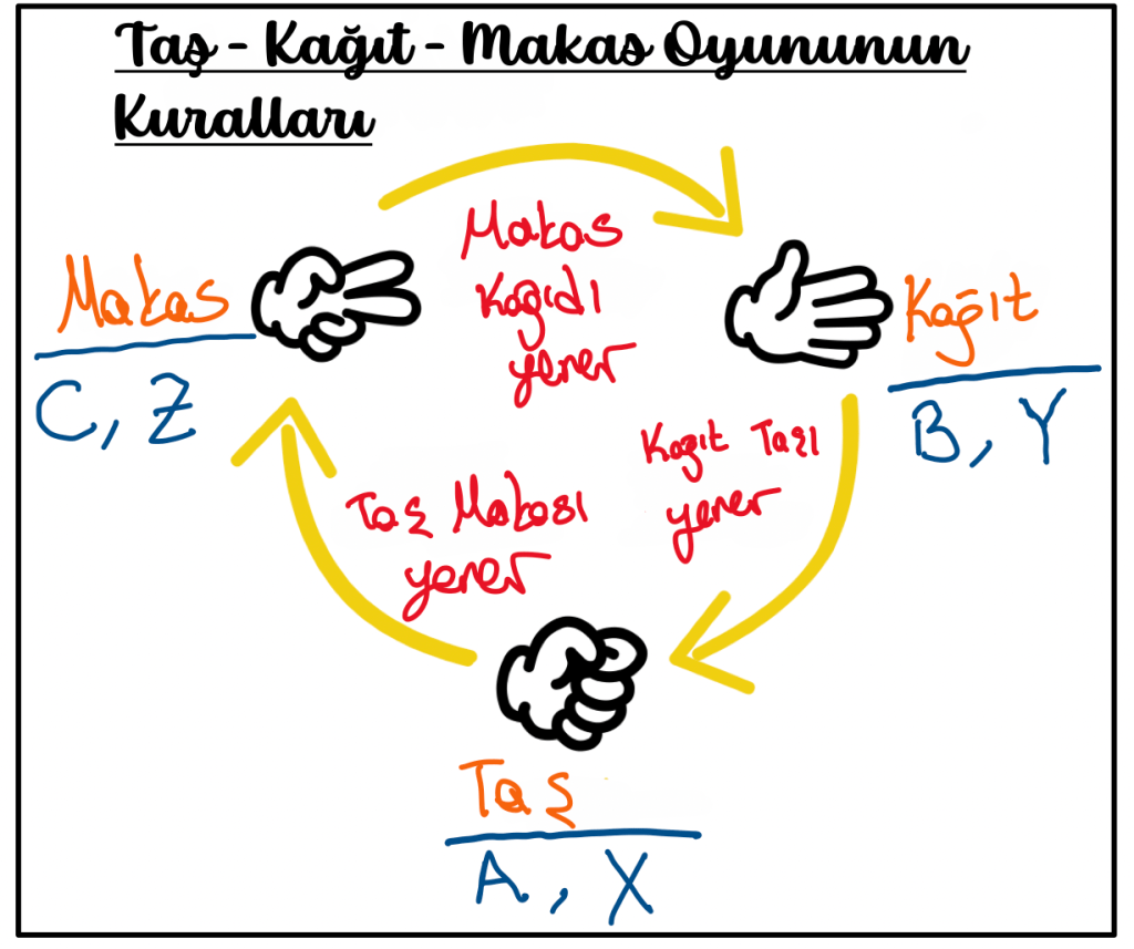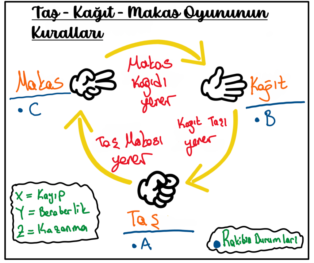 Hemen karşımıza bir taş kağıt makas haritası alalım ve ilgili harfleri üstüne yazalım. Böylelikle kodlama yaparken kafamız karışmasın.